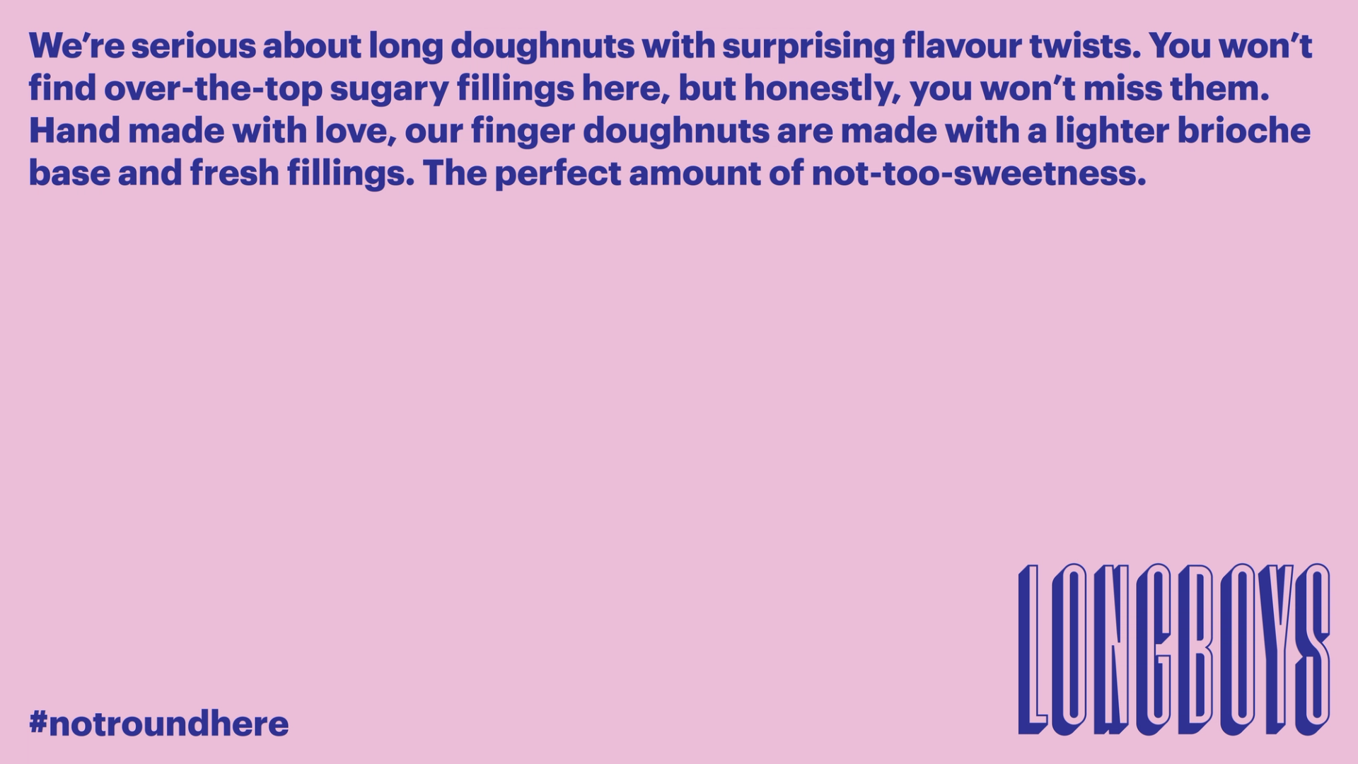 Longboys is bold and fresh, using colour and attitude to differentiate itself. Copy developed as part of the branding is attitudinal and tongue-in-cheek: “Not ‘round here”, “Less dense, more long”. Longboys takes flavour seriously, but not themselves. A doughnut with a smile is where they’re at.