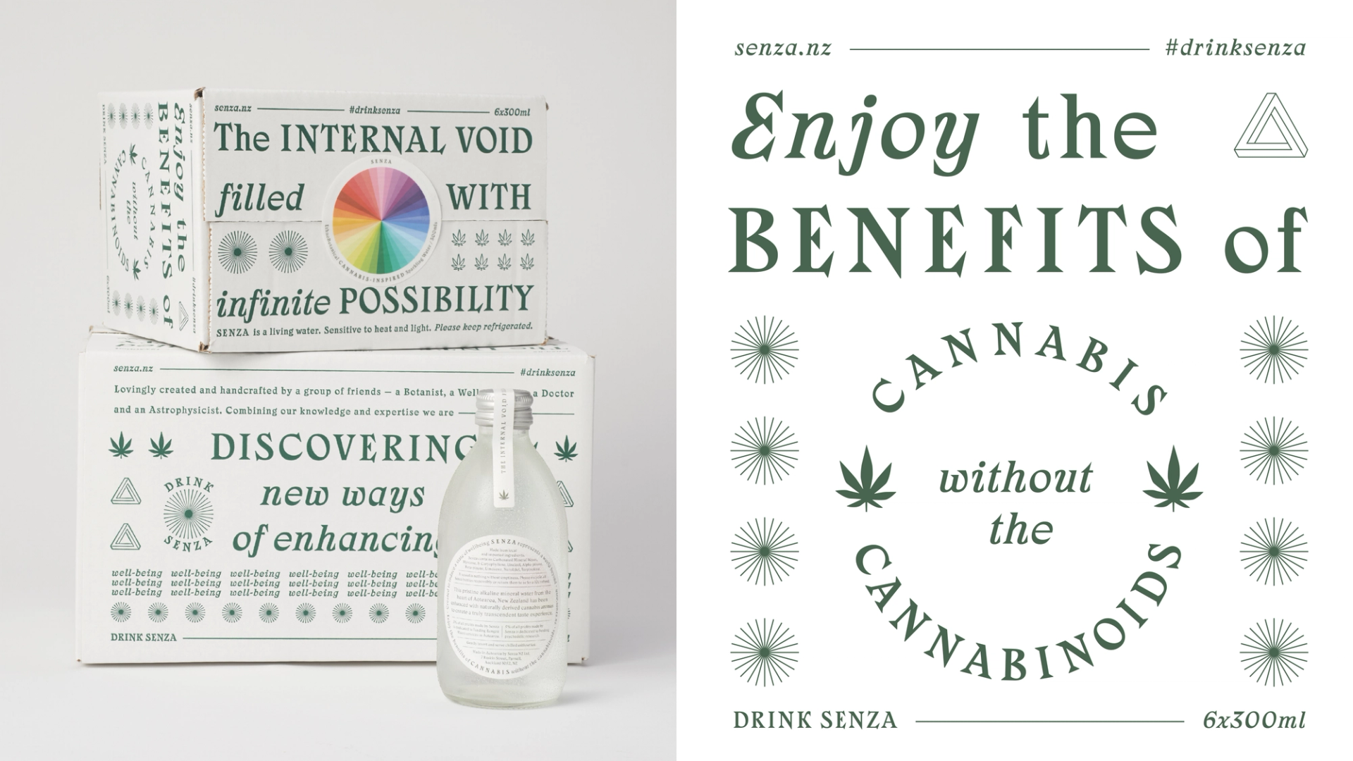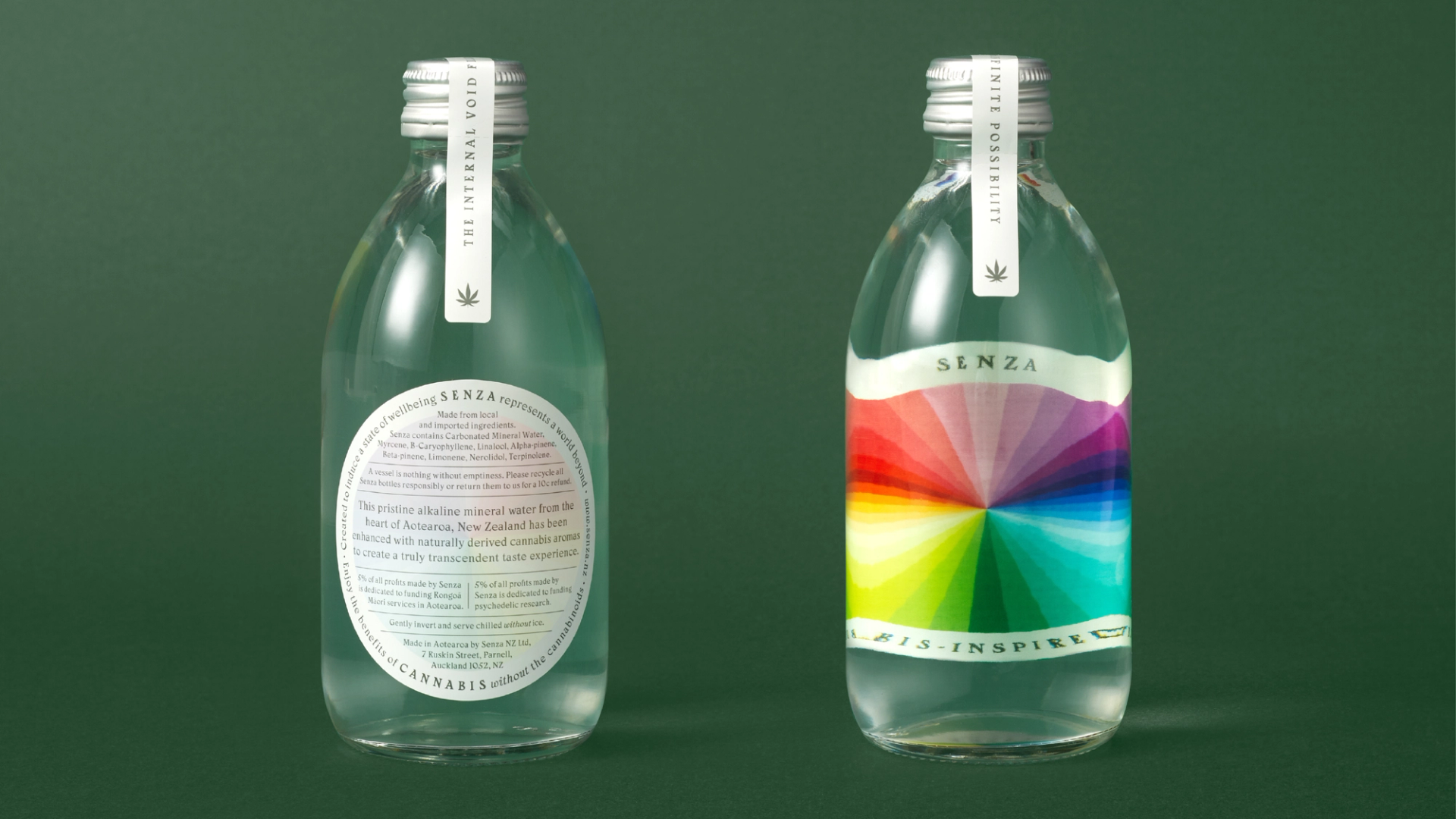 Senza is a cannabis-inspired sparkling water, the first of its kind—a genre-defining concept. Infused with organic, adaptogenic, plant-derived terpenes designed to induce a state of wellbeing, Senza sits in the emerging field known as cannabimimetics (good luck saying it). Plainly said, Senza gives you the benefits of cannabis without the cannabinoids.